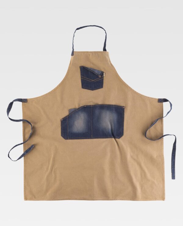 Avental com peitilho em tecido de canvas combinado com ganga. Um bolso no peito com costuras a pico de fantasia e um bolso central de corte assimétrico compartimentado com bolso relojoeiro interior. Fita de tecido de ganga regulável com botões metálicos na gola, e fitas para ajustar na cintura. Desenho contemporâneo com acabado desgastado e rebites de cobre.