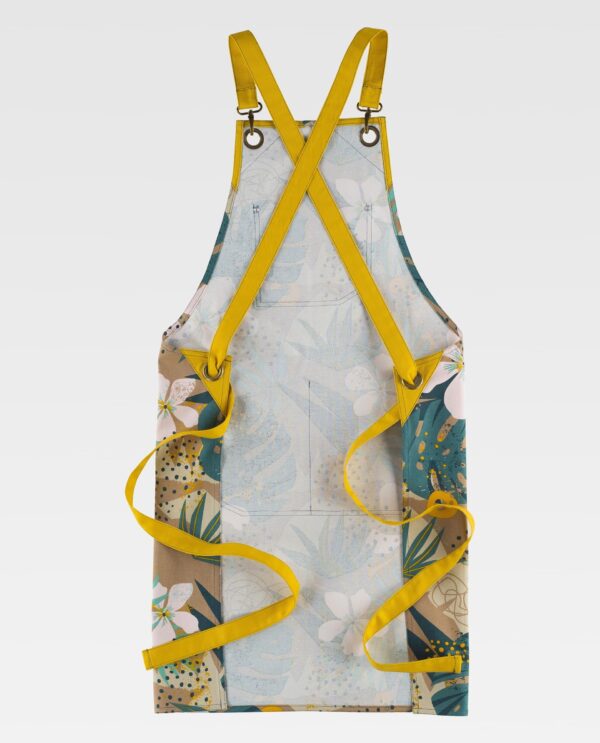 Avental com peitilho em tecido canvas estampado combinado. Un bolso de chapa no peito. Um grande bolso de chapa compartimentado e passador. Fitas fixadas com fivela metálica e cruzadas atrás para ajustar na cintura. Design contemporâneo com rebites em cobre.