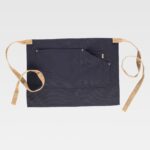 Avental francês curto em tecido de canvas. Um bolso central de corte assimétrico compartimentado com bolso relojoeiro interior. Fitas de lona para ajustar na cintura. Desenho contemporâneo com rebites de cobre.
