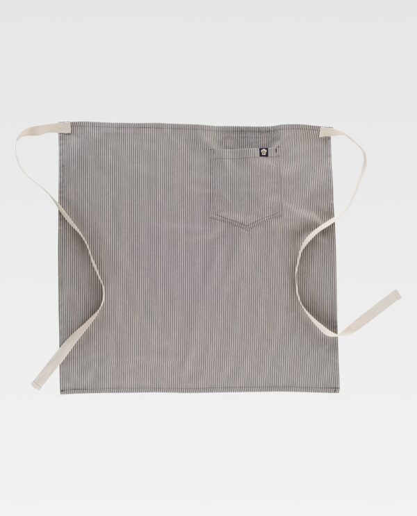 Avental francês longo estampado a riscas. Um bolso lateral de chapa. Cintas para ajustar na cintura.