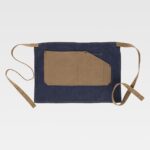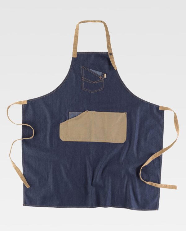 Avental com peitilho em tecido de ganga combinado com canvas. Um bolso no peito com costuras a pico de fantasia e um bolso central de corte assimétrico compartimentado com bolso relojoeiro interior. Fita de tecido de canvas regulável com botões metálicos na gola, e fitas para ajustar na cintura. Desenho contemporâneo com rebites de cobre.