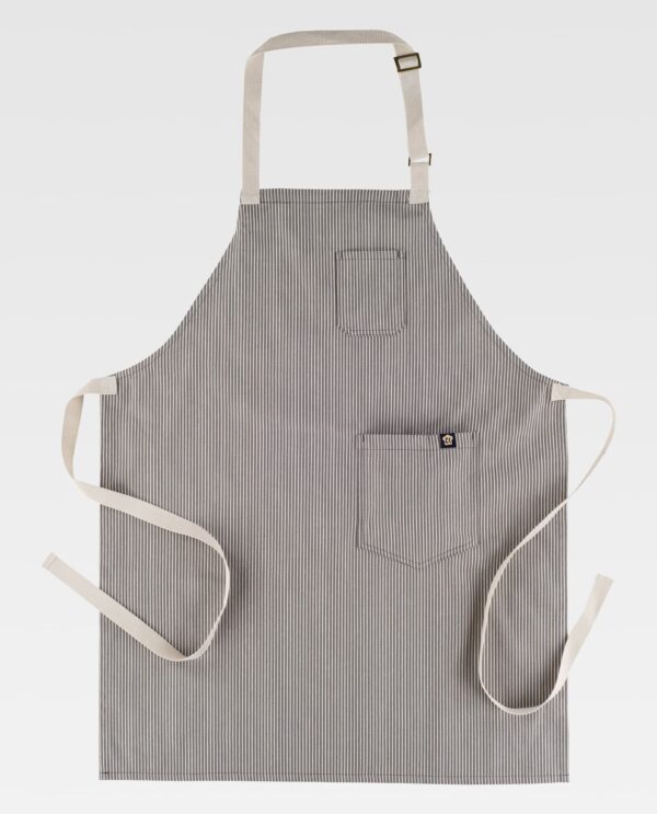 Avental com peitilho estampado a riscas. Um bolso no peito e outro lateral, ambos de chapa. Cinta regulável com fivelas metálicas no pescoço e tiras para ajustar na cintura.