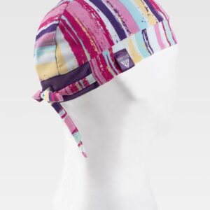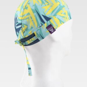 Bandana com fita grossa para ajustar na nuca acabada com debruns em contraste.