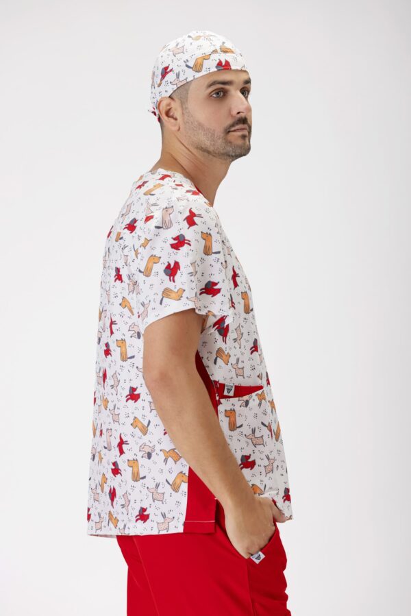 Bandana de tecido elástico e estampada. Ajuste com elástico combinado e cordões na nuca.