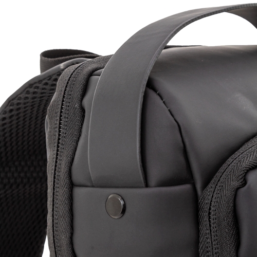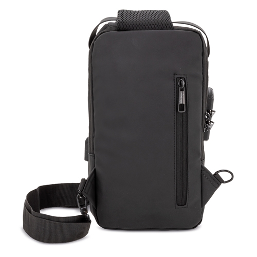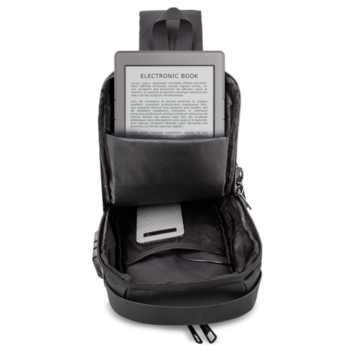 Bandoleira resistente a salpicos, com fecho de segurança e ligação USB para power bank.Interior acolchoado com bolsos e tiras acolchoadas para tablets até 8″.Bolso traseiro anti-roubo e bolso no tirante.Faixa refletora.