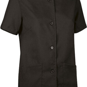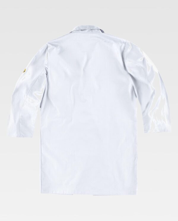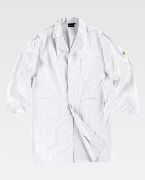 Bata ESD com gola, lapela e fecho central de molas ocultas. Um bolso no peito e dois laterais. Um bolso para canetas. Manga comprida. A separação entre os fios condutores do tecido ajuda a dissipar a carga electrostática acumulada, evitando assim a formação de faíscas que puderem provocar um incêndio.