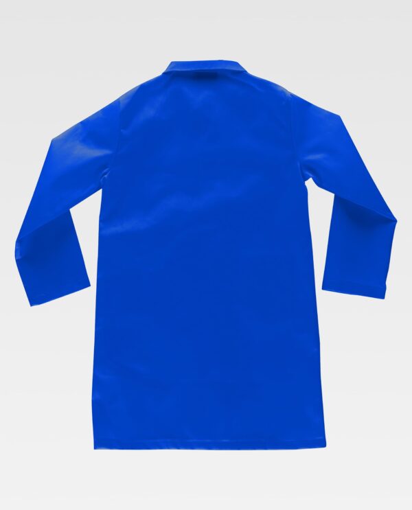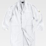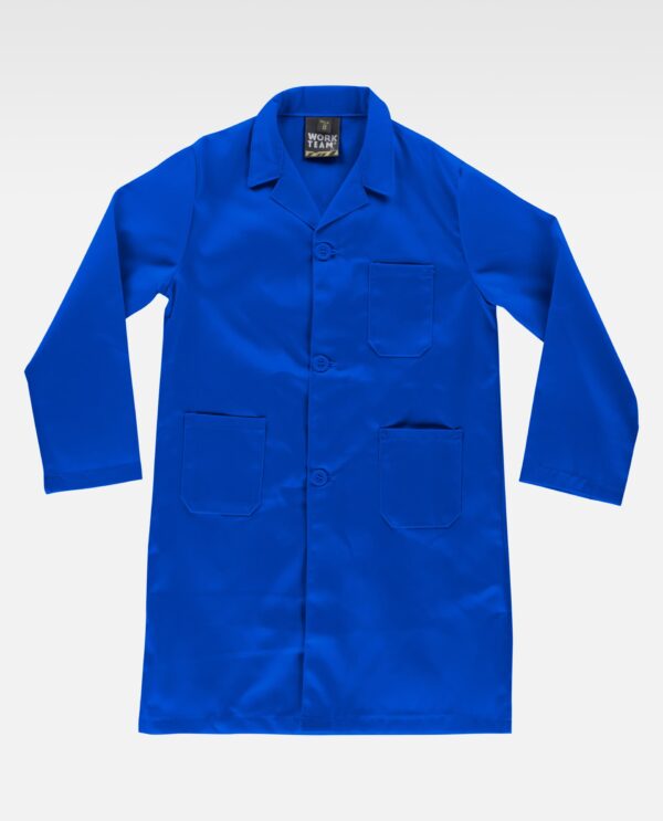 Bata criança com gola sobreposta e fecho central de três botões. Um bolso no peito e dois laterais de chapa. Manga comprida.