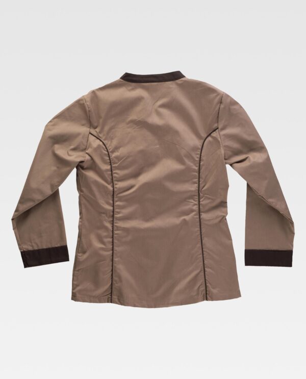 Casaca de senhora combinada, entalhada e de manga cumprida. Colarinho cruzado e fecho central de presilhas ocultas. Um bolso semi-embutido no peito e dois bolsos laterais interiores. Gola, debrum nos vincos, detalhe no bolso do peito e punhos em contraste.