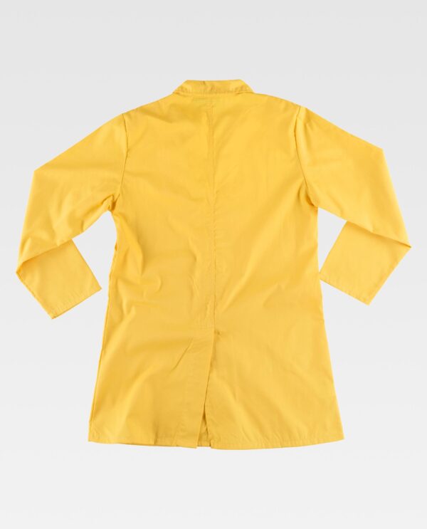 Bata unissex com gola sobreposta e fecho central de presilhas ocultas. Um bolso no peito e dois de chapa laterais. Manga cumprida.