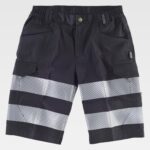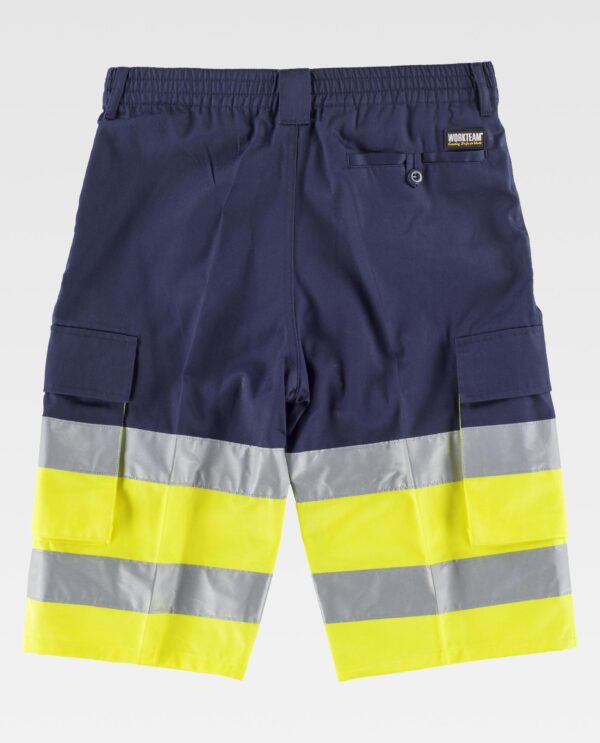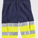 Bermuda combinada de alta visibilidade fitas e fitas refletoras. Dois bolsos de abertura inclinada nos costados. Dois bolsos laterais com fita refletora, fole e lapela de velcro. Um bolso traseiro semi-embutido com fecho de presilha e botão. Duas fitas refletoras nas perneiras. Parte inferior de alta visibilidade. Elástico na cintura. Passadores. Fecho de botão e braguilha de fecho de correr.