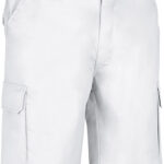 Bermuda de trabalho multibolsos. Confecionada em tecido sarja de algodão com poliéster para maior durabilidade e resistência. Cintura com pregas à frente e elástico atrás para maior conforto e melhor ajuste. Dois bolsos inclinados na cintura, dois bolsos laterais com velcro e um bolso traseiro na direita para fácil acesso. Costuras principais duplas e pontos de tração extra, reforçadas com presilhas de segurança para maior durabilidade e resistência. Métodos adequados de marcação: serigrafia, transfer, vinil, bordados, cosidos. Ideal como roupa de trabalho y uniformes de verão.