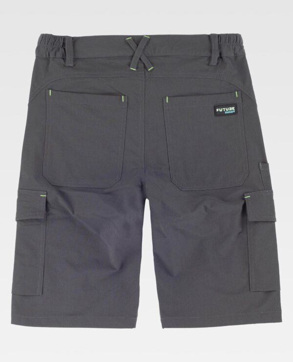 Bermuda com tecido elástico. Dois bolsos com abertura inclinada nas laterais. Dois bolsos de chapa com prega inferior e bolsa de velcro nas pernas. Bolsa com compartimento para canetas. Dois bolsos traseiros de chapa. Presilhas fluorescentes contrastantes. Elástico nas laterais da cintura. Presilhas. Fecho com botão metálico e braguilha com fecho de correr.