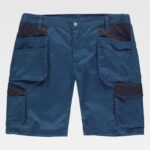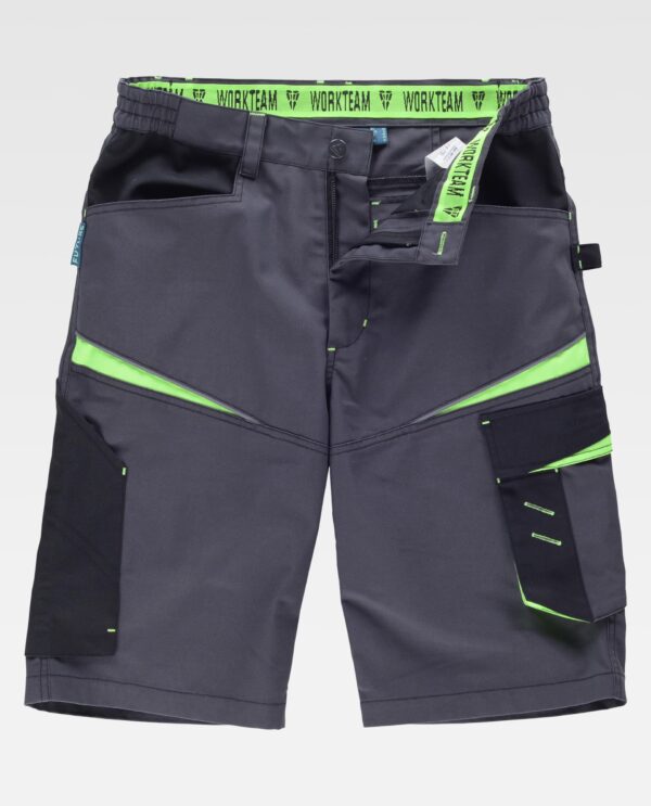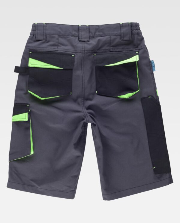 Calções tripla cor com tecido canvas. Dois bolsos abertura inclinada nos laterais. Um bolso lateral de espátula, outro de carga con fecho de velcro e outro sobrepor para canetas. Dois bolsos traseiros com fecho de velcro. Tira porta martelo. Reforço com fecho de velcro para joelheiras de protecção. Vivos refletores e presilhas em contraste. Elástico nos laterais da cintura. Presilhas. Fecho de botão metálico e braguilha com cremalheira.