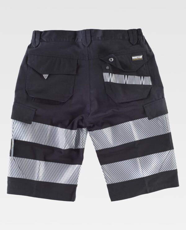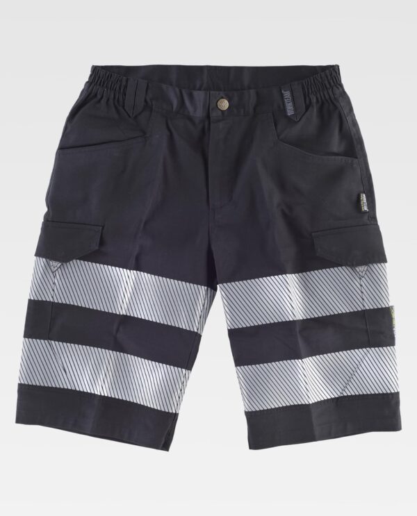 Bermuda com fitas refletoras segmentadas. Dois bolsos inclinados nos laterais, dois bolsos inseridos com pala de mola oculta. Dois bolsos traseiros com pala de mola oculta. Duas fitas refletoras segmentadas termo-adesivas nas perneiras. Fita decorativa personaliza no bolso traseiro. Elástico nos laterais da cintura. Presilhas de diferente cor. Fecho de botão metálico e braguilha com cremalheira.