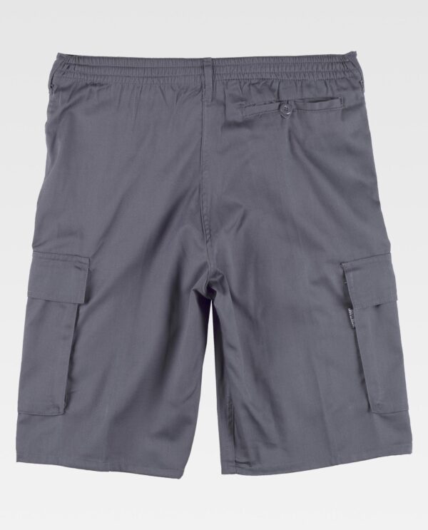 Bermuda com dois bolsos de abertura inclinada nos costados e dois bolsos de carga laterais com lapela de velcro. Um bolso traseiro semi-embutido com fecho de botão. Elástico na cintura. Passadores. Fecho de botão e braguilha de fecho de correr.