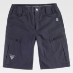 Bermuda com dois bolsos de abertura inclinada nos costados e dois bolsos de carga laterais com lapela de velcro. Um bolso traseiro semi-embutido com fecho de botão. Elástico na cintura. Passadores. Fecho de botão e braguilha de fecho de correr.