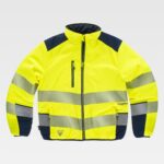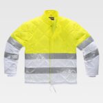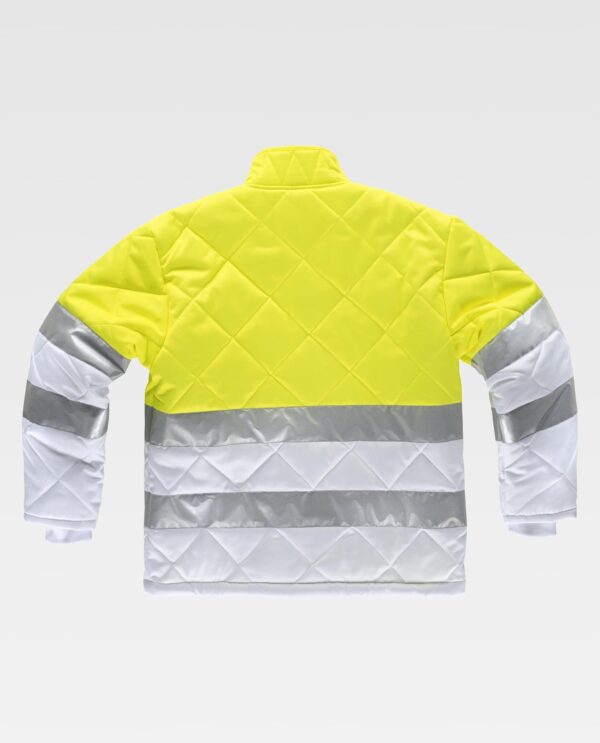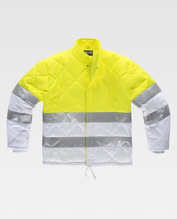 Casaco acolchoado de alimentação, combinado com fitas reflectoras. Parte superior de alta visibilidade. Gola alta e fecho de presilhas ocultas. Costura de diamante. Duas fitas reflectoras no peito, nas costas e nas mangas. Luvas no interior das mangas. Bainha com cordão ajustável.