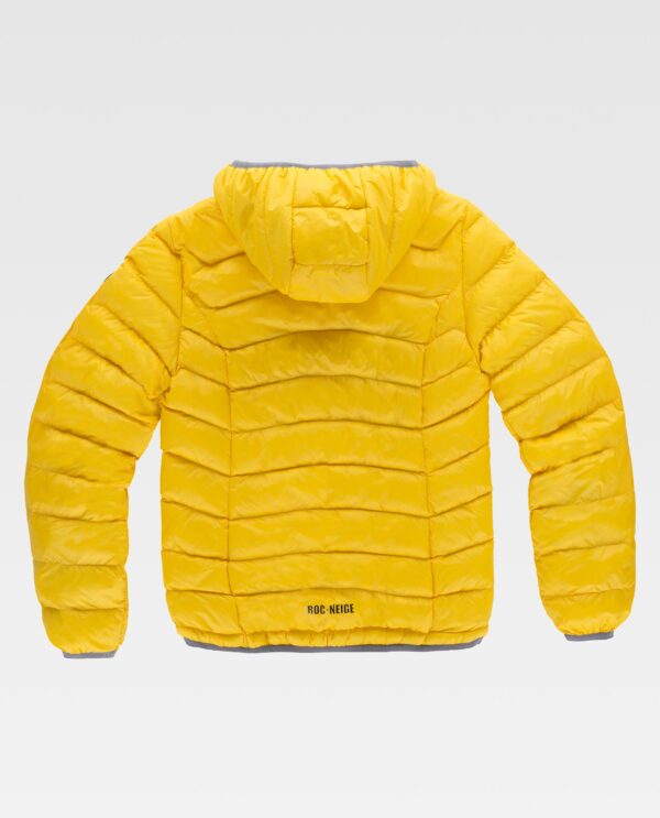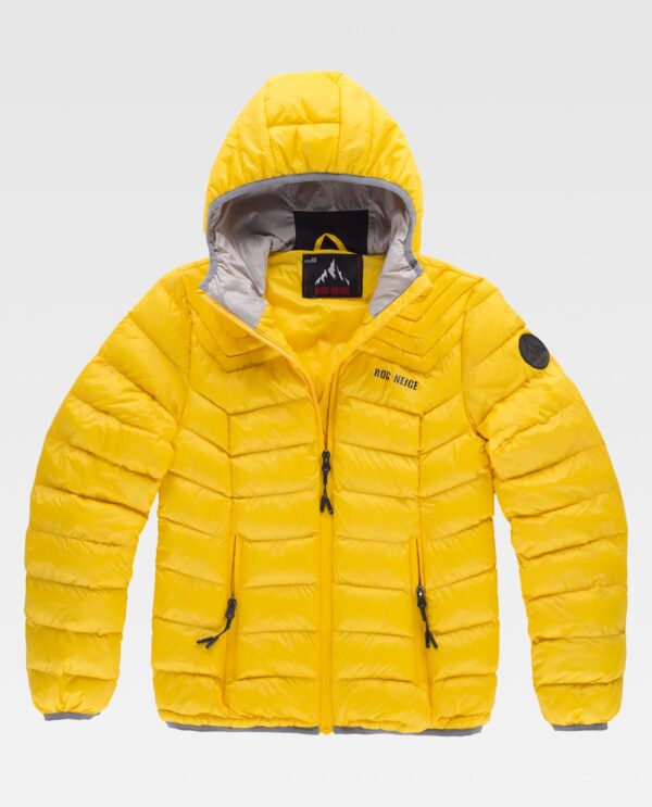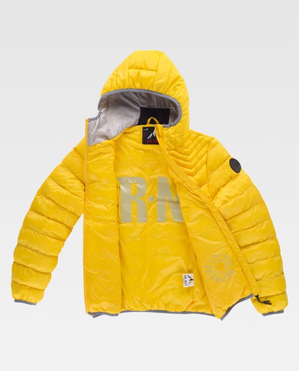RËFAR Jaqueta de mulher acolchoada com um desenho nas costuras que destaca a imagem do corpete. Tecido macio no exterior 100% nylon. Tratamento repelente à água e cremalheiras impermeáveis. Dois bolsos laterais interiores com cremalheira. Embainhado com viés elástico. Logótipos estampados no peito e costas e detalhes estampados no interior. Poder calorífico: 300+. Emchimento sustentável procedente da reciclagem de garrafas de água com o certificado Repreve®.