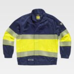 Casaco ignífugo, antiestático com proteção para soldadura, de alta visibilidade com fitas refletoras. Gola alta e fecho de correr e velcro ocultos por aba falsa. Um bolso no peito semi-embutido com aba de segurança e presilha oculta. Dois bolsos laterais semi-embutidos com aba de segurança. Duas fitas refletoras segmentadas, termoadesivas no peito, costas e mangas, com peça central de alta visibilidade. Punho com elástico. Elástico nas laterais da cintura.