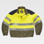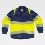 Casaco ignífugo, antiestático com proteção para soldadura, de alta visibilidade com fitas refletoras. Gola alta e fecho de correr e velcro ocultos por aba falsa. Um bolso no peito semi-embutido com aba de segurança e presilha oculta. Dois bolsos laterais semi-embutidos com aba de segurança. Duas fitas refletoras segmentadas, termoadesivas no peito, costas e mangas, com peça central de alta visibilidade. Punho com elástico. Elástico nas laterais da cintura.