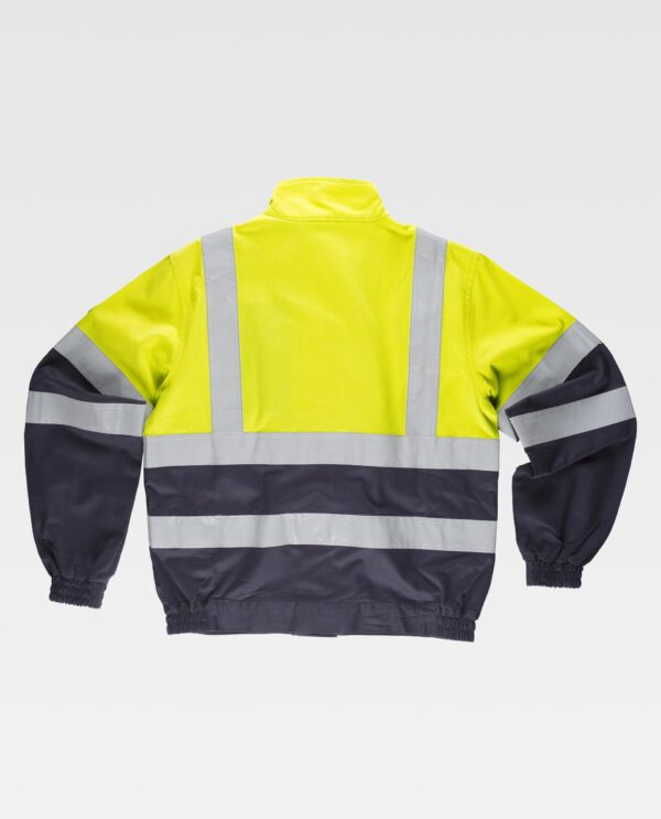 Blusão ignífugo, antiestático com protecção para soldadura e arco eléctrico, de alta visibilidade. Gola alta, fecho de correr de metal e presilhas ocultas por aba. Um bolso no peito e dois bolsos laterais, todos semi-embutidos com aba de seguridade e presilha oculta. Uma fita refletora ignífuga nos ombros e dois no peito, costas e mangas. Punho com elástico. Dois passantes no peito. Elástico nos laterais na cintura.