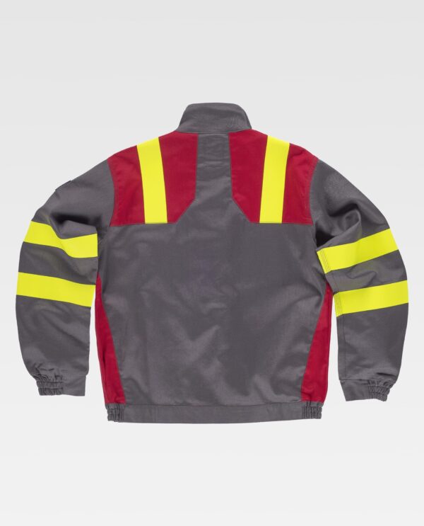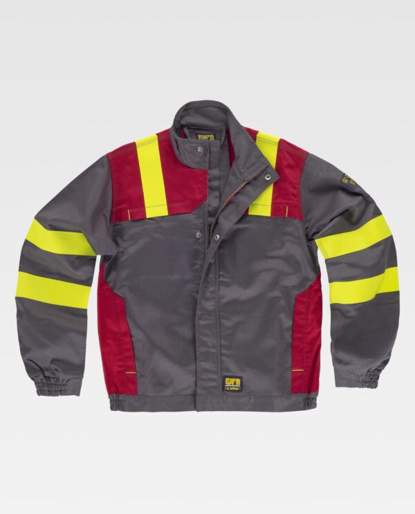Blusão combinado ignífugo e antiestático com proteção contra soldadura e arco elétrico, visibilidade melhorada com fitas fluorescentes amarelas e costura tripla. Gola alta e fecho de correr de metal e presilhas ocultas por aba postiza. Dois bolsos no peito e dois bolsos laterais, todos semi-embutidos com abas de seguridade e fecho de presilhas. Uma fita termo-adesiva fluorescente amarela ignífuga nos ombros e duas nas mangas. Punho com elástico. Elástico nos laterais da cintura.