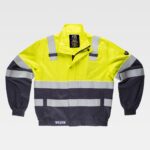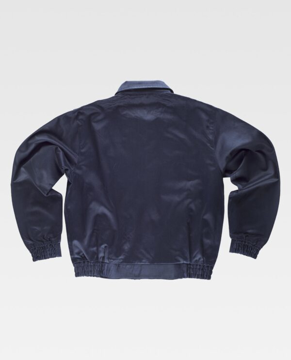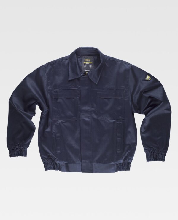 Blusão ignífugo e antiestática com gola tipo camiseiro e corpete na frente. Fecho de correr de metal oculto por aba com velcro. Dois bolsos de chapa no peito com lapela de seguridade e dois bolsos semi-embutidos laterais com lapela de seguridade. Punho com elástico. Costas com dobra e elástico nos laterais da cintura.