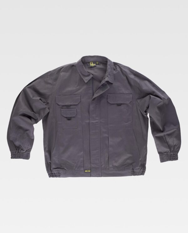 Casaco de algodão. Gola tipo camiseiro e fecho de correr de náilon oculto por aba com velcro. Dois bolsos de chapa no peito com bolso auxiliar sobreposto todos com lapela de velcro e ganchos. Dois bolsos laterais de abertura inclinada com fole. Punho com elástico. Costas com dobras. Fecho de velcro na cintura e elástico nos laterais.