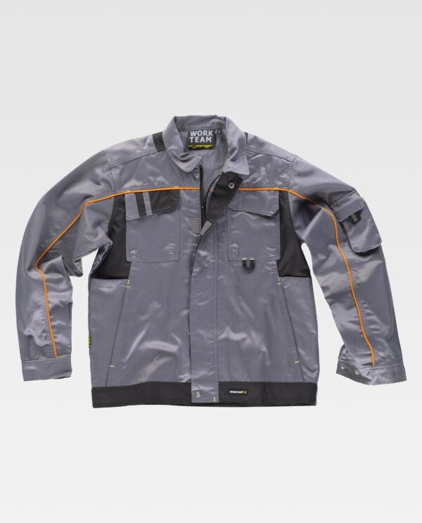 Casaco combinado de costura tripla em tecido Beaver Nylon de alta resistência, anti-nódoas e repelente aos líquidos. Gola tipo camiseiro e corpete na parte de frente com debrum em contraste que segue na manga. Fecho de correr oculto por aba com velcro e presilhas. Dois bolsos de chapa no peito com lapela de velcro. Argola no bolso superior. Dois bolsos no costado e dos bolsos laterais de abertura inclinada. Um bolso na manga com lapela e velcro. Punhos com presilhas e ganchos. Cortes decorativos nas costas. Presilhas em contraste e Ajuste de presilhas nos laterais da cintura.