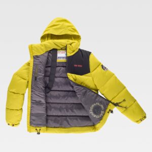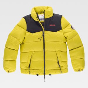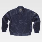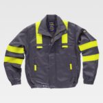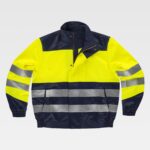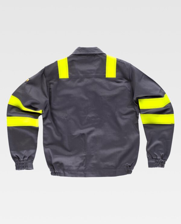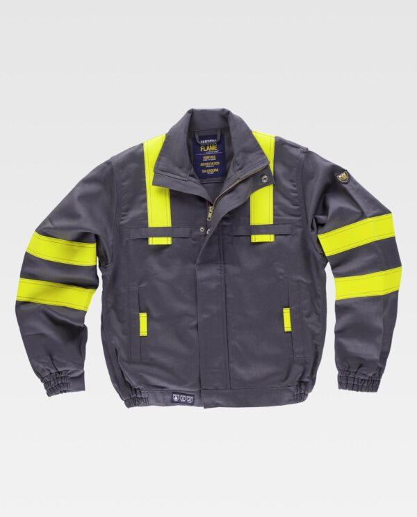 Blusão para soldador, ignífugo e antiestático de costura tripla. Gola alta e fecho de correr de metal e presilhas ocultas por aba postiza. Dois bolsos no peito e dois bolsos laterais, todos semi-embutidos com abas de seguridade e fecho de presilhas. Uma fita fluorescente amarela ignífuga nos ombros e duas nas mangas. Punho com elástico. Corpete nas costas. Elástico nos laterais da cintura.