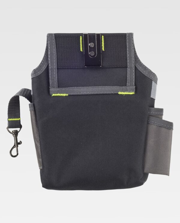 Bolsa de ferramentas com vários bolsos e várias aberturas. Argola metálica e alça com mosquetão. Gancho metálico para prender ao cinto. Viés em contraste. Dimensões: 23x19x4 cm aprox.