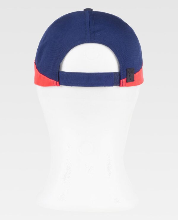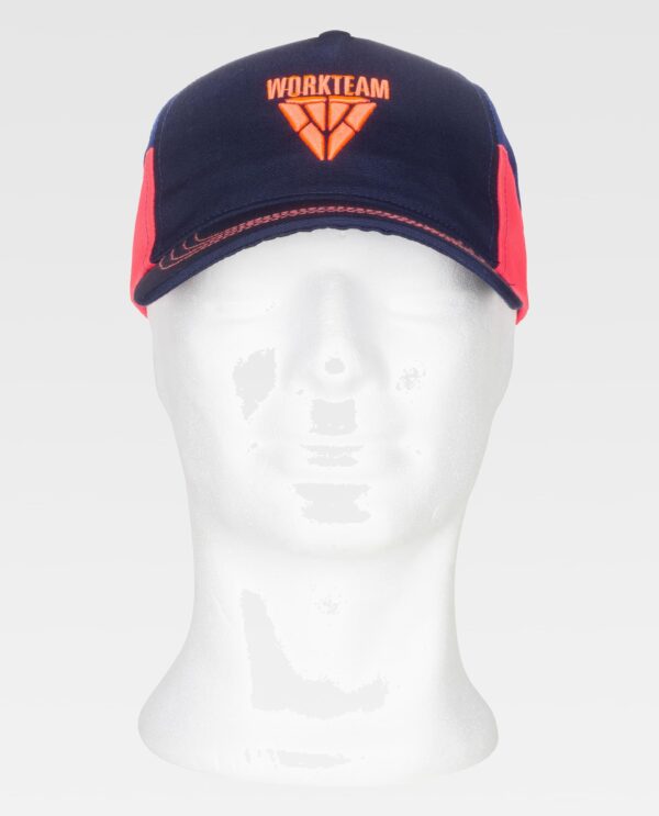 Boné tripla cor com tecido canvas. Logotipo bordado na frente. Vivos decorativos nos laterais. Ajuste traseiro de velcro.