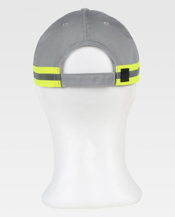 Boné com faixa refletora flúor. Ajuste traseiro com velcro.