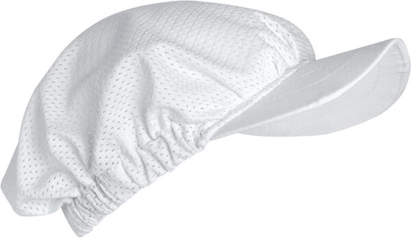 Touca de cozinha com malha, estilo Gatsby. Viseira forrada com tecido de sarja de algodão com poliéster para maior durabilidade e resistência, parte superior da malha que favorece a ventilação. Viseira semi-rígida e curva para maior conforto. Elástico em torno de todo o contorno que se adapta confortavelmente e recolhe todo o cabelo. Costuras interiores com overlock para maior resistência. Métodos adequados de marcação: serigrafia, vinil, transfer. Ideal como roupa de trabalho e uniformes de hotelaria e restauração.
