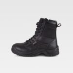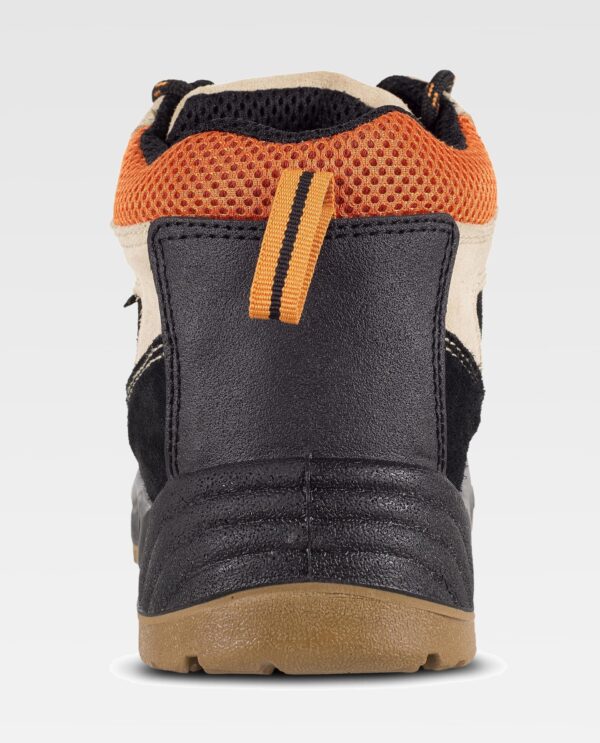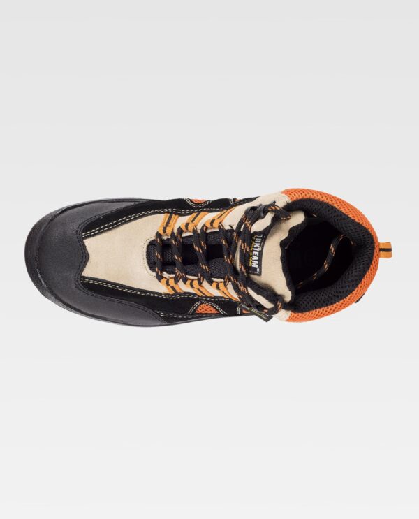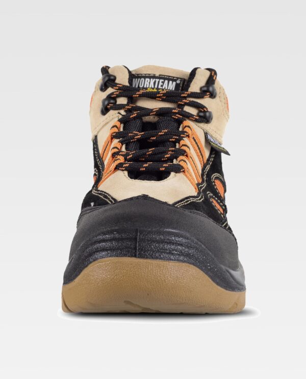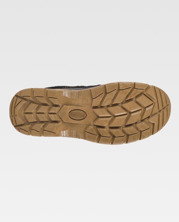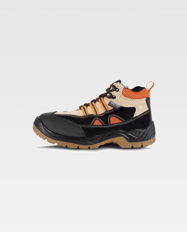 Bota croute com cordões, tipo trekking. Biqueira e palmilha de aço. Sola PU bidensidade. Propriedades antiestáticas. Absorção da energia na zona do salto. Resistente aos hidrocarbonetos. Resistente à perfuração. Resistente ao deslizamento sobre ladrilho cerâmico com dissolução de sabão e sobre aço com glicerina.