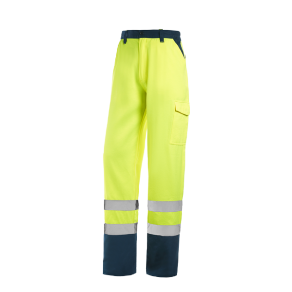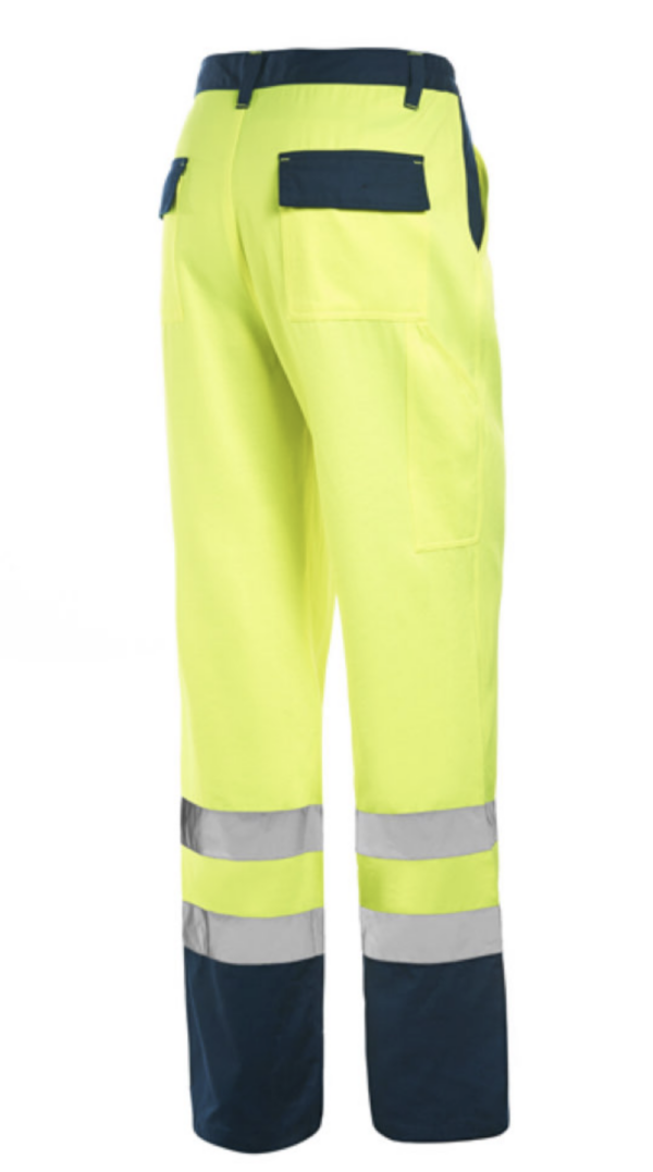CALÇA MULTI-BOLSOS DE ALTA-VISIBILIDADE Em sarja de 235g./m280%Poliester 20%Algodão 6 Bolsos / Faixas refletoras cinza de 7cm