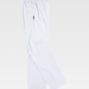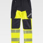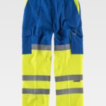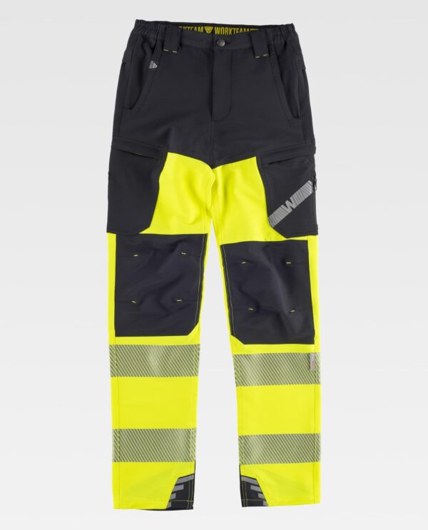 Calças elásticas combinadas de alta visibilidade com fitas reflectoras segmentadas. Dois bolsos laterais com abertura oblíqua, dois bolsos laterais em plaston com fecho de correr e bolsos sobrepostos. Dois bolsos traseiros interiores. Cortes decorativos nos joelhos. Duas fitas reflectoras segmentadas termo-adesivas nas pernas. Fita decorativa personalizada no bolso da perna. Elástico nos lados da cintura. Presilhas largas. Detalhes reflectores. Fecho de botão metálico e braguilha com fecho de correr.