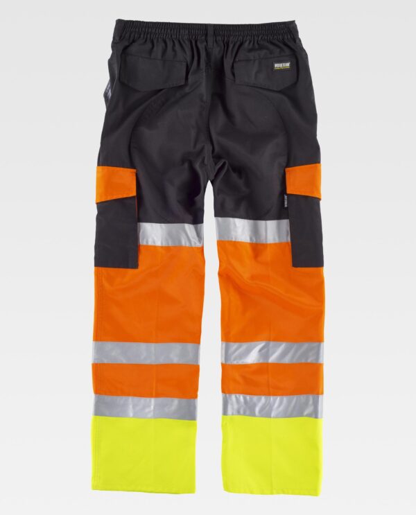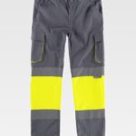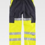 Calça combinada com reforços e alta visibilidade e fitas refletoras. Dois bolsos de abertura inclinada nos costados, dois bolsos cargo laterais com lapela em bico e velcro. Dois bolsos traseiros interiores com lapela de velcro. Reforço no assento. Tricolor e com três fitas refletoras nas perneiras. Elástico na cintura. Passadores. Fecho de botão e braguilha de fecho de correr.