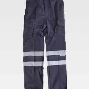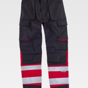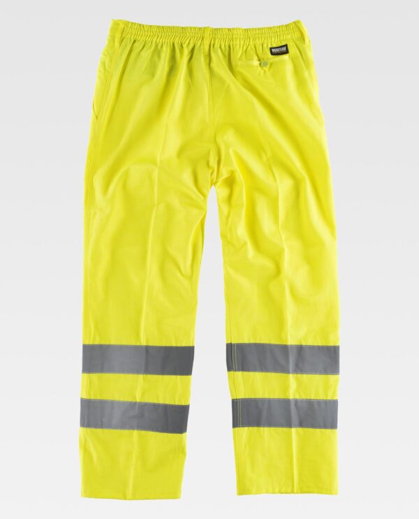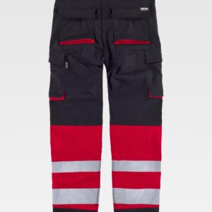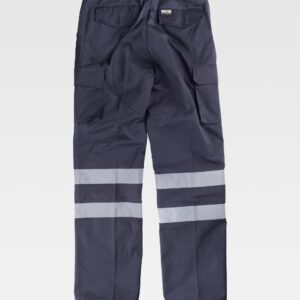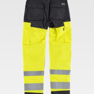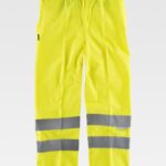 Calça de alta visibilidade com fitas refletoras. Dois bolsos de abertura inclinada nos costados. Um bolso traseiro semi-embutido com fecho de presilha e botão. Duas fitas refletoras nas perneiras. Elástico na cintura. Passadores. Fecho de botão e braguilha de fecho correr.