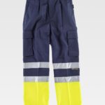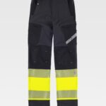 Calça de alta visibilidade com fitas refletoras. Dois bolsos de abertura inclinada nos costados. Um bolso traseiro semi-embutido com fecho de presilha e botão. Duas fitas refletoras nas perneiras. Elástico na cintura. Passadores. Fecho de botão e braguilha de fecho correr.