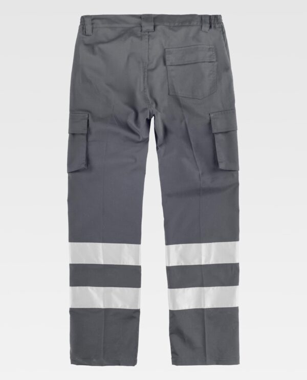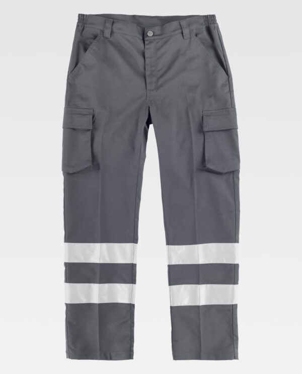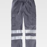 Calças de visibilidade melhorada com fitas reflectoras em modelo desenho slim fit. Dois bolsos de abertura inclinada nos lados, dois bolsos de carga laterais com lapela de velcro. Um saco de plastão traseiro com lapela de velcro. Duas fitas reflectoras nas presilhas das pernas. Elásticos laterais na cintura. Presilhas para o cinto. Fecho de botão e fecho de correr.
