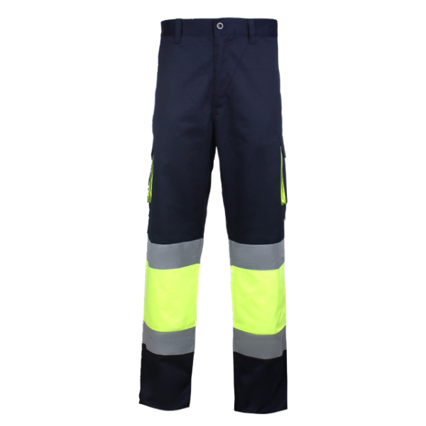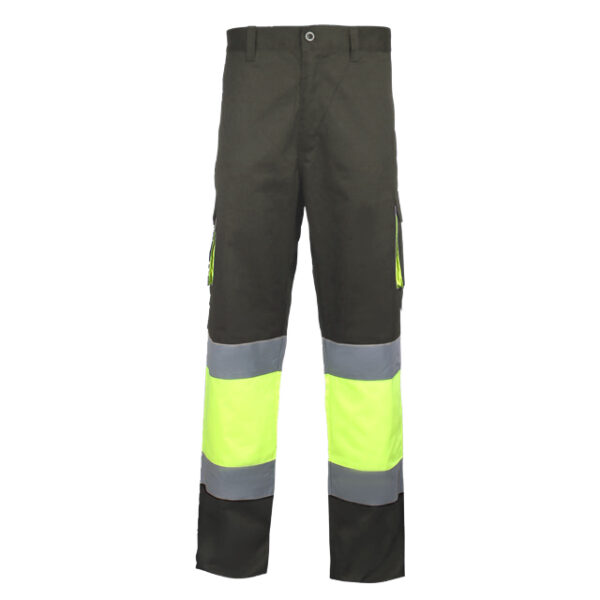 CALÇA MULTI-BOLSOS DE ALTA-VISIBILIDADE Em sarja de 235g./m280%Poliester 20%Algodão 6 Bolsos / Faixas refletoras cinza de 7cm
