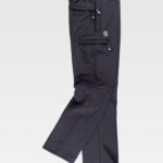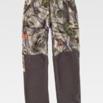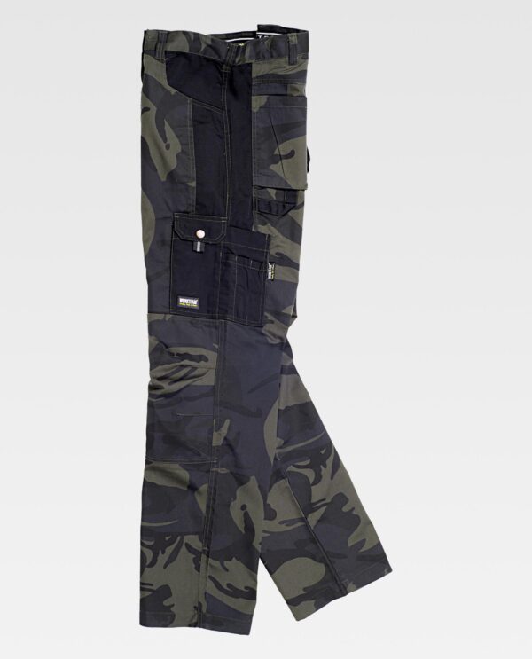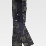Calça combinada com impresso de camuflagem. Dois bolsos de abertura inclinada nos costados, dois bolsos cargo laterais com lapela de presilha metálica, ganchos e bolsos auxiliares sobrepostos. Dois bolsos traseiros de chapa. Passador porta martelo. Cortes decorativos com pregas nas joelheiras. Sem elástico na cintura e cinta antiderrapante interior para subjecção da camisa. Passadores. Fecho de botão e braguilha de fecho de correr metálicos.