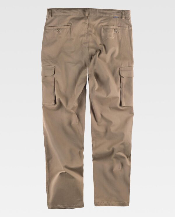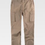 Calça tipo “cargo” em tecido elástico. Dois bolsos de abertura inclinada nos costados e um bolso relojeiro, dois bolsos cargo laterais com lapela de velcro. Dois bolsos traseiros interiores de botão e casa de botão. Passadores. Fecho de botão e braguilha de fecho de correr.