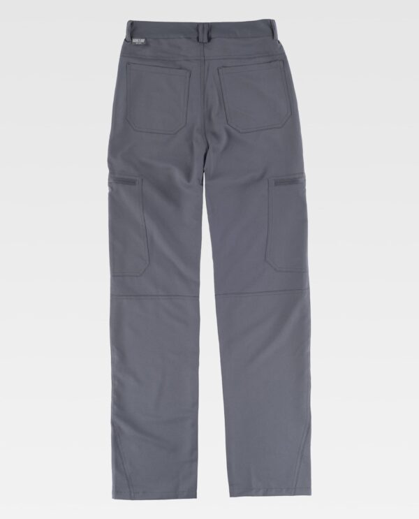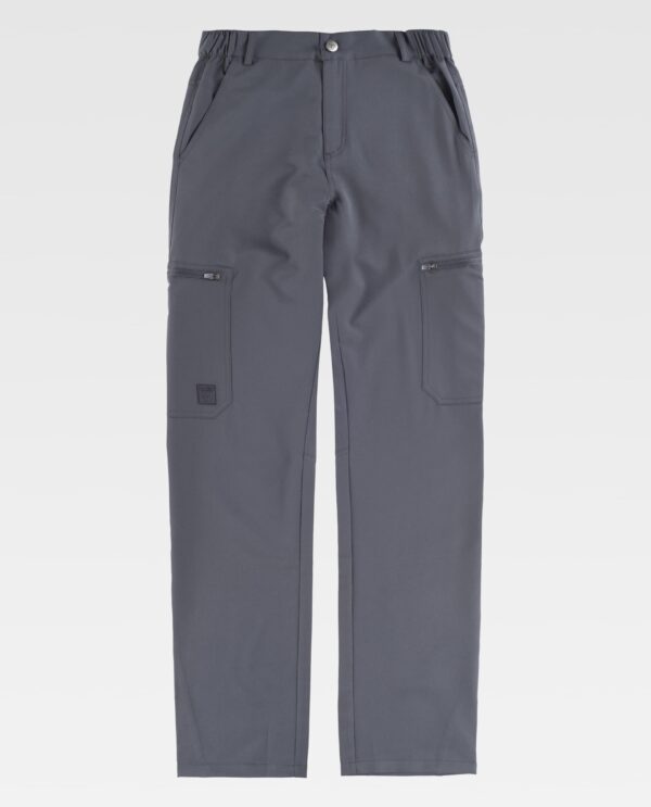 Calças elásticas com dois bolsos com abertura inclinada nos lados. Dois bolsos de chapa com fecho de correr nas pernas e dois bolsos de chapa traseiros. Elástico nos lados da cintura. Presilhas . Fecho de botão metálico e braguilha com fecho de correr.
