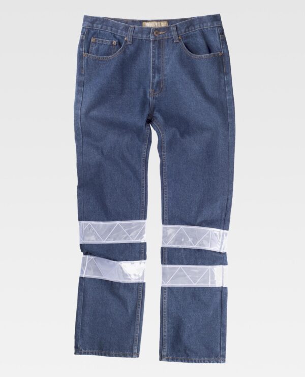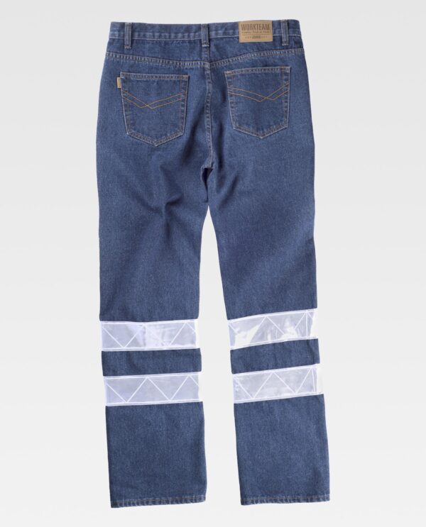 Calça de ganga com cinco bolso com refletoras. Tecido resistente, corte regular e tamanho padrão. Dois bolsos de abertura redonda nos costados com bolso relojoeiro. Dois bolsos de chapa traseiros sem rebites e com costuras de um pico de fantasia. Corpete traseiro. Duas fitas refletoras microprisma nas perneiras. Cor azul-escuro e pespontos duplos em contraste em tom de ocre. Rebites nos bolsos na frente. Etiqueta traseira de pele. Passadores. Fecho de botão metálico e braguilha de fecho de correr de metal.
