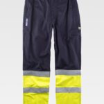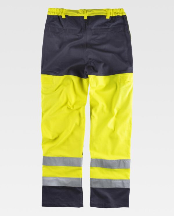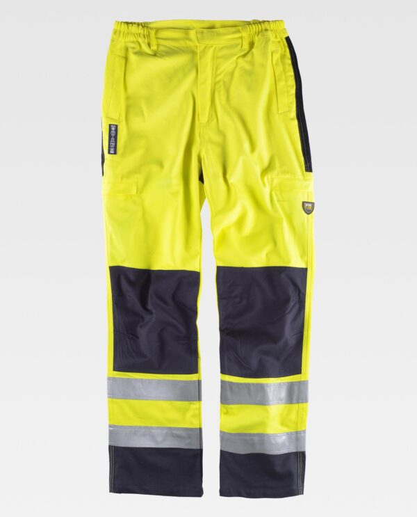 Calça ignífuga, antiestática com protecção para soldadura e arco eléctrico, de alta visibilidade. Dois bolsos de abertura vertical nos costados, um bolso lateral e dois bolsos traseiros, todos semi-embutidos com aba de seguridade e presilha oculta. Joelheiras reforçadas. Duas fitas refletoras ignífugas nas perneiras. Joelheiras, assento e baixo combinados. Elástico na cintura. Passadores. Fecho de presilha oculta e braguilha de fecho de correr de metal.