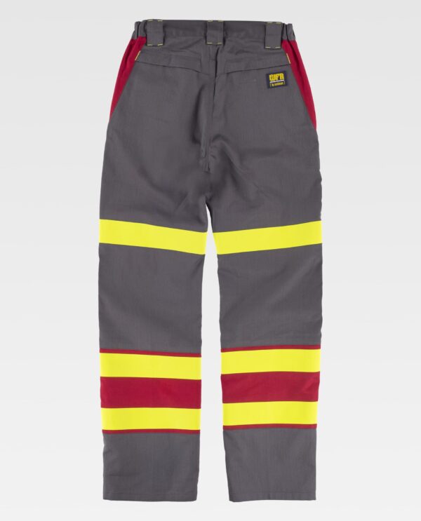 Calça combinada ignífuga e antiestática com proteção contra soldadura e arco elétrico, visibilidade melhorada com fitas fluorescentes amarelas e costura tripla. Dois bolsos de abertura inclinada nos costados e dois bolsos traseiros, todos semi-embutidos com lapelas de seguridade. Duas fitas termo-adesivas fluorescentes amarelas ignífugas nas perneiras. Elástico na cintura. Passadores. Fecho de botão metálico e braguilha de fecho de correr de metal.
