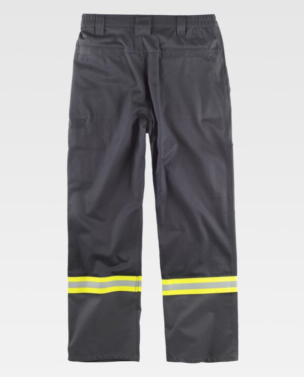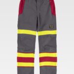 Calça ignífuga, antiestática com protecção para soldadura e arco eléctrico, visibilidade melhorada com uma fita refletora-fluorescente. Dois bolsos de abertura inclinada com lapela de seguridade e presilha oculta nos costados. Um bolso lateral e dois bolsos traseiros, todos semi-embutidos com lapela de seguridade e presilha oculta. Una fita reflectora-fluorescente ignífuga nas perneiras. Elástico na cintura. Passadores. Fecho de presilha oculta e braguilha de fecho de correr de metal.