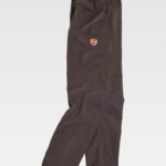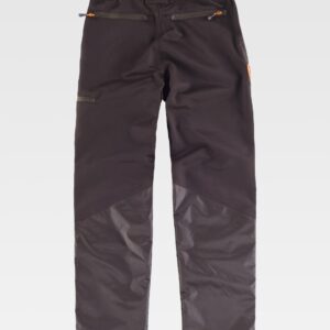 Calça impermeável com dois bolsos de abertura redonda nos costados, um bolso cargo lateral com fole central e lapela de presilha oculta. Dois bolsos traseiros interiores com fecho de correr. Pregas nas joelheiras. Elástico nos laterais da cintura e abranges nas costuras interior. Passadores. Fecho de presilha metálico e braguilha de fecho de correr. Revestido.